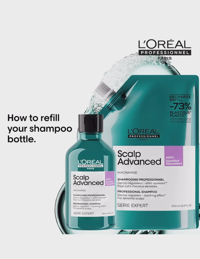 Le shampoing Dermo-régulateur de la gamme Scalp Advanced de L’Oréal Professionnel est spécialement formulé pour les cuirs chevelus sensibles sujets aux démangeaisons. Enrichi en niacinamide, une vitamine de la famille B3, il nettoie délicatement le cuir chevelu tout en procurant une sensation apaisante et calmante. Désormais rechargable, le shampoing anti-inconforts est Idéal pour rééquilibrer et soulager les cuirs chevelus irrités.